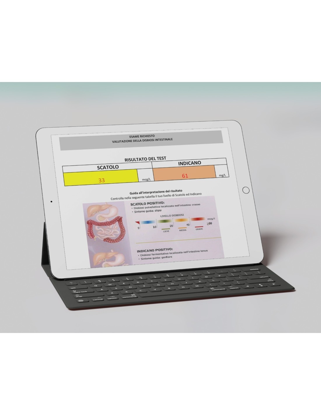 Si misura la condizione dell'intestino per individuare l'eventuale presenza di Disbiosi intestinale, che porta a scompensi di vario genere e causa sintomi come Gonfiore, Stipsi, dissenteria, bruciori, infiammazione dell'alvo, difficoltà di digestione.