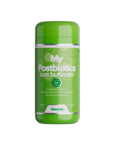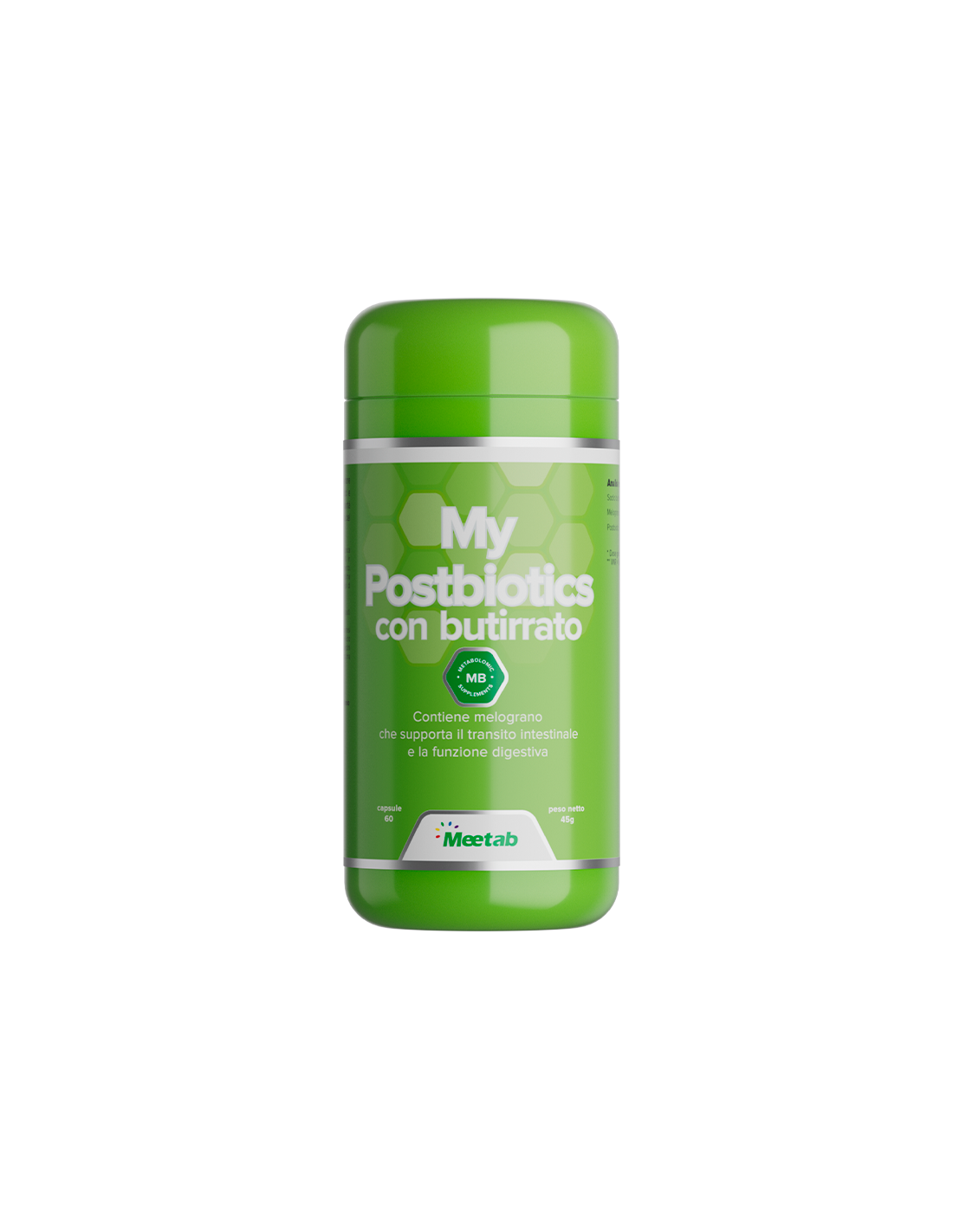 Il My Postbiotics è un integratore alimentare composto da butirrato, postbiotici e acido ellagico che aiuta a migliorare la salute intestinale, ridurre l’infiammazione, regolare il sistema immunitario, potenziare la sensibilità insulinica, proteggere cuore e cervello e prevenire lo stress ossidativo, grazie a effetti sinergici su microbioma, antiossidazione e regolazione cellulare.