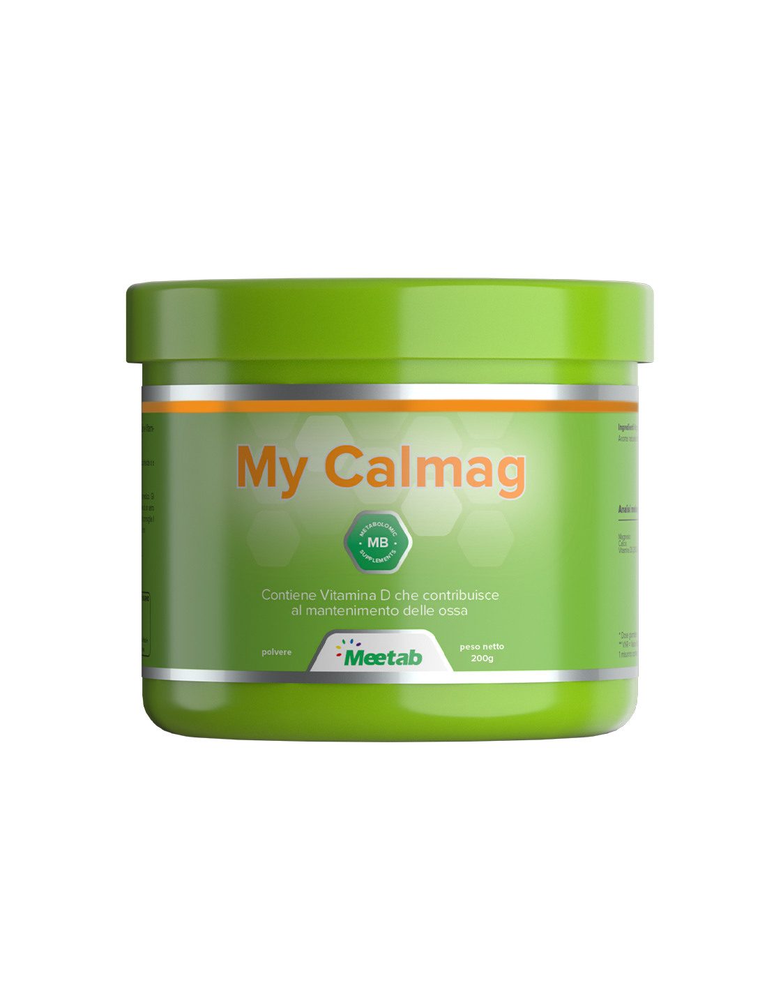 Integratore di magnesio, calcio e vitamina D in polvere. Il magnesio partecipa a più di 300 funzioni cellulari.